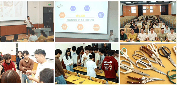 推进会现场,合作企业精诚智科技带来二十六款极具代表性的剪刀实物产品,构筑起微型“产品博览馆”。公司资深技术专家与市场负责人从电商市场需求、工艺细节、结构原理到设计初衷进行全方位深度解析。“这把小小的厨房剪,各部分的形态变化关乎用户使用的可靠性和可用性;这个可拆卸结构,背后是我们对产品易清洁、安全性的用户洞察。”企业代表的讲解将冰冷工具转化为充满温度的生活美学载体,让同学们深刻体会“设计驱动创新”的真实内涵,现场气氛热烈、互动频频,为同学们带来一堂市场前沿的“设计启蒙课”。
