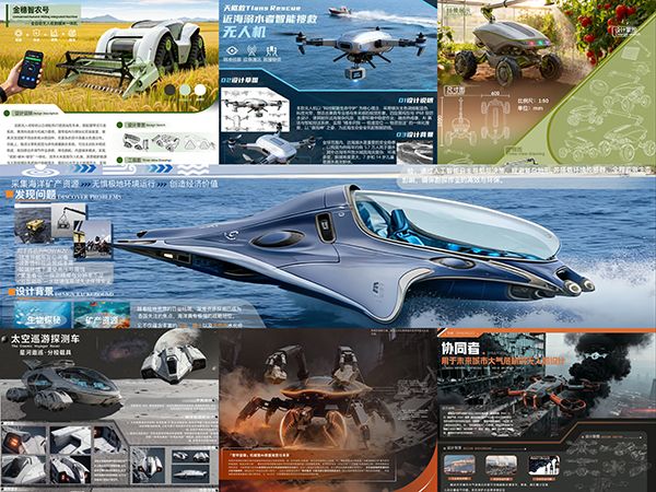 本届参赛作品在主题选择上更贴近时代议题,呈现出显著的创新视野与社会关怀。作品类型涵盖智慧农业、海洋生态环保、宇宙空间探索、未来交通工具、灾害救援装备及智能穿戴设备等多个前沿方向。同学们不仅展现出对AIGC技术的熟练运用,更体现出将科技创新与人文关怀相融合的设计思维,多组作品针对全球性挑战提出了富有创见的解决方案。随着AIGC技术的不断演进,传统的产品设计流程正在被重新定义。本次竞赛中,一位产品设计专业的参赛同学感言:“AI不是替代设计师的工具,而是拓展我们创造力的伙伴。它让我们能够跨越技术的壁垒,将注意力更多地集中在创意本身。”