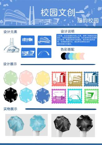 张慧芯同学以校徽、标志性建筑为核心元素,使用了剪纸的非遗技艺,呈现校园建筑特色风貌。色彩选用校色及青春活力色调,兼具实用性与美观性,既为师生遮风挡雨,也承载校园记忆,是实用与具有纪念价值的校园文化载体。