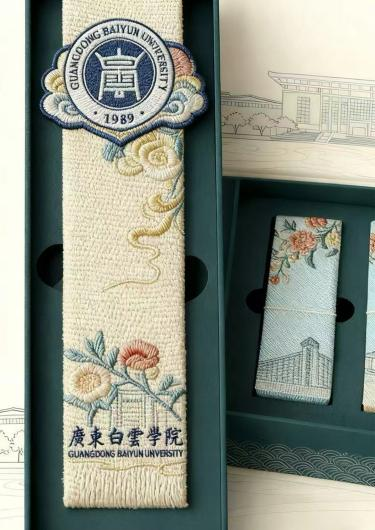 夏鑫艳把校徽、“广”字、建校年份“1989”做成垫高绣核心,四周以木棉、菊纹和校舍线稿填充,整体不过5×15cm,却用了6种蓝白丝线和2种青绿丝线,“针脚越密,图案越挺”。为兼顾实用,她选择耐磨的米白棉麻做底布,并在尾部加浅棕流苏,礼盒直接做成书脊造型,“送校友或自己用都不突兀”。让它既是实用书签,也是承载“校韵+非遗”双重价值的文化伴手礼——以一针一线,把白云学院的温度与广绣的匠心,藏进每一页书页里。