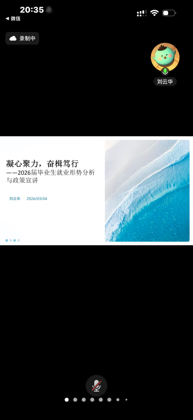 当晚,刘云华通过线上平台为全体毕业班同学讲授“就业第一课”。课程围绕当前就业形势、求职准备策略、简历制作与面试技巧、就业权益保护及基层就业项目等内容展开,贴近学生实际需求。她鼓励同学们主动适应就业市场变化,调整心态、明确目标、积极行动,充分利用学校提供的就业指导资源,把握好春季招聘关键期。互动环节中,同学们积极提问,现场氛围热烈。课程尾声,全体毕业班辅导员依次为同学们送上深情寄语。一句句饱含期许的话语,既有对学子们专业成长的欣慰与肯定,也有对大家勇敢奔赴职场的鼓励与祝福。真挚的情感在云端流淌,汇聚成温暖而坚定的力量,让屏幕前的同学们倍感鼓舞,更加满怀信心地去迎接未来的挑战与机遇。