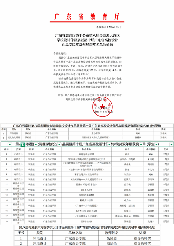 近日,由广东省教育厅主办的第八届粤港澳大湾区学校设计作品展暨第十届广东省高校设计作品学院奖双年展获奖结果正式公布。在此次双年展中,我院师生凭借扎实的专业功底与出色的创新实践能力,共斩获18项荣誉。获奖覆盖教师组、学生组及指导教师奖三大类别,学生组荣获一等奖2项、二等奖1项、三等奖11项,教师组荣获三等奖2项,其中朱琦聪、高旭怡两位老师获指导教师奖,全方位彰显了学院的教学综合实力与师生优秀的专业素养与实践能力。
