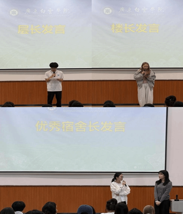 首先,楼长、层长与优秀宿舍长依次上台发言,他们全程以共建和谐友爱的宿舍环境为核心主题,同时结合自身楼层、宿舍管理的实际工作经验,从同学间团结协作、日常宿舍共建、公共区域维护、问题及时协调等多个方面交流心得与方法,倡导各宿舍凝心聚力、互帮互助,携手打造优质、和谐、有温度的楼层宿舍环境。