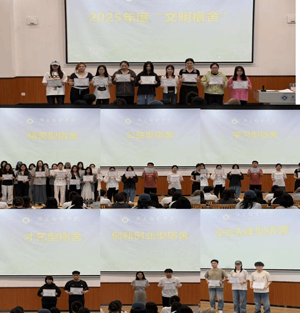接着,大会进入表彰环节,按照顺序分别为获评2025年度“文明宿舍”,以及学习型、精美型、公益型、才艺型、创新创业型、党员先锋型等特色宿舍的集体进行表彰并颁发荣誉证书,充分肯定大家在学风建设、环境美化、公益服务、文化创新等方面的突出表现。这些优秀的宿舍集体是一站式服务社区建设的综合标杆,彰显着各宿舍在日常管理、文明素养、集体建设等方面的综合优异表现,也为全院宿舍树立了文明建设的优秀榜样。