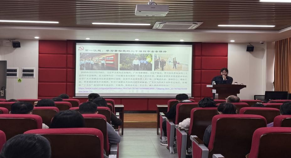 会议第一议题由教工党支部组织委员林洁组织全体教师党员深入学习了党的二十届四中全会精神。通过领学与研讨,与会人员深刻领会了党中央关于坚持和完善中国特色社会主义制度、推进国家治理体系和治理能力现代化的决策部署。支部要求全体党员自觉统一思想行动,提升政治能力,将学习成效转化为推动工作的实际动力。