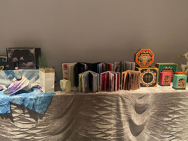 另一展台上,展台上“凤凰天香”系列文创作品尤为吸睛,还有融合传统建筑纹样的立体书、带有民俗元素的礼盒套装,以及一双双以AI技术重构传统艺术文化的定制球鞋,构成了“传统艺术数字化转化”的实践样本。黄静表示,这些作品是学生将AIGC生成的传统纹样与包装设计、产品开发结合的尝试,其中部分产品已与校外企业达成合作,是“产教融合”理念的落地体现。