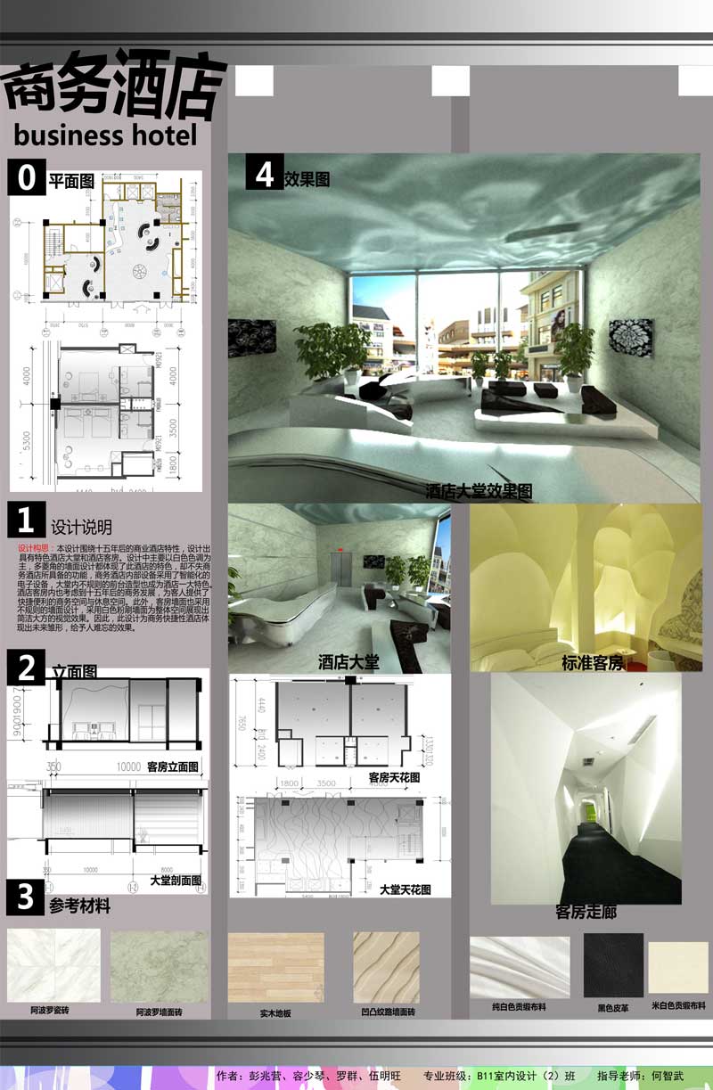 作品名称:商务酒店;专业班级:B11室内设计;作者:彭兆营、容少琴、罗群、伍明旺